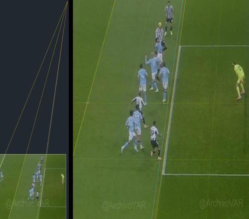 裁判组在进行越位判定时认为曼城后卫鲁本-迪亚斯的位置是导致第一次参与射门的吉马良斯并不越位的原因,然而通过Archivo VAR发布的传球瞬间透视分析图可以看出,吉马良斯的脚尖实际上已经明显越位。