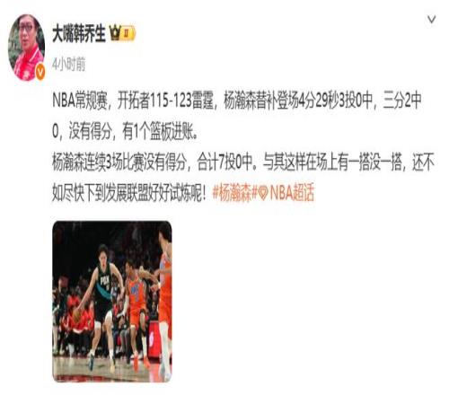 于是,名嘴韩乔生提出的那个观点,便显得格外现实与中肯:“与其这样在场上有一搭没一搭,还不如尽快下到发展联盟好好试炼呢!”